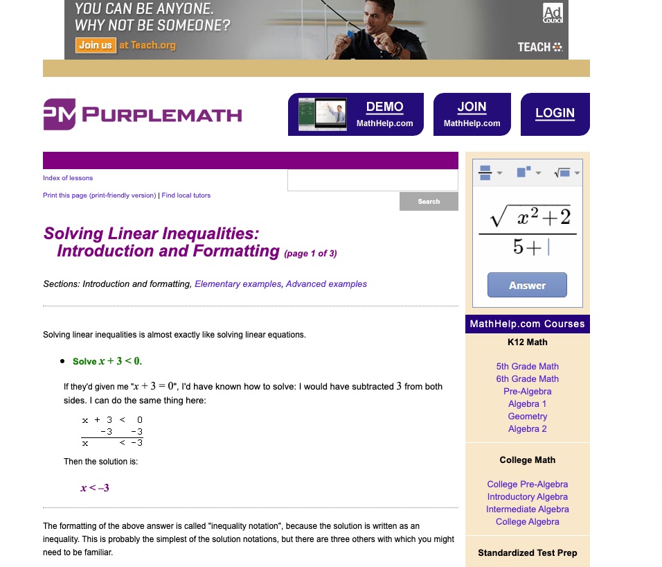 From Elizabeth Stapel at Purplemath, this module helps students understand how to solve linear inequalities with an introduction to the topic using both inequality notation and a g...