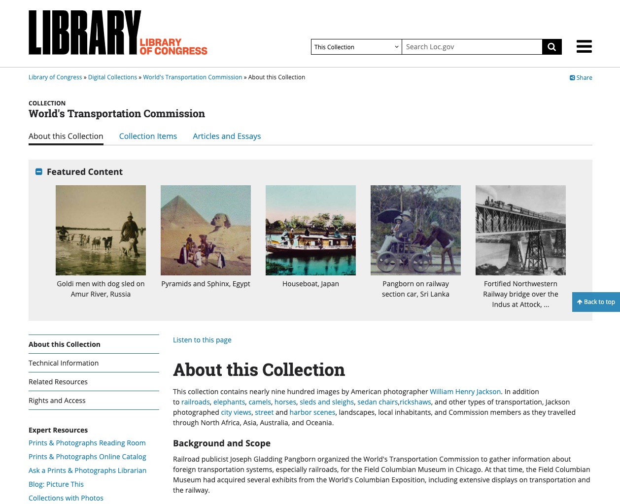 This collection contains nearly nine hundred images by American photographer William Henry Jackson. In addition to railroads, elephants, camels, horses, sleds and sleighs, sedan ch...