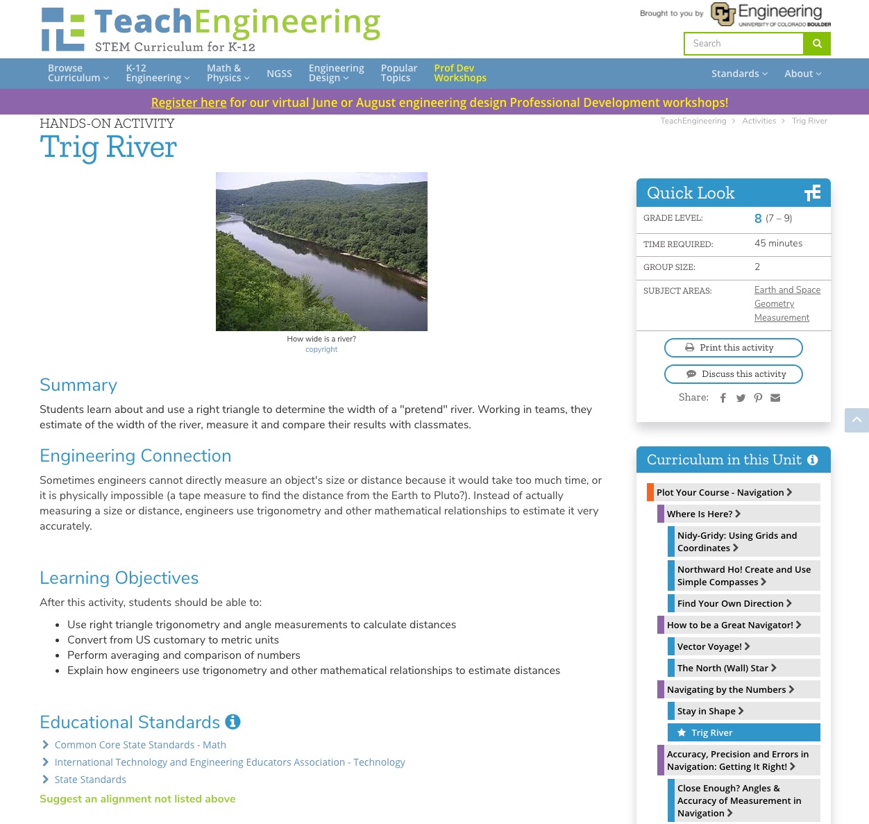 Students learn about and use a right triangle to determine the width of a "pretend" river. Working in teams, they estimate of the width of the river, measure it and compare their r...